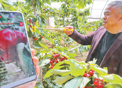 4月9日,秦皇岛市海港区海阳镇鲤泮庄村的祺和大樱桃种植基地内,村民苏士明使用网络平台直播推销大樱桃。 人民视觉