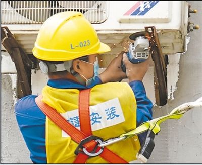 4月1日,在陕西西安明德门北区老旧小区改造项目中,工人对居民空调进行位移调整。