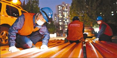4月28日,北京市城市照明管理中心的工人检查整理管材,准备架空线入地工程施工,服务胡同和老旧小区改造。