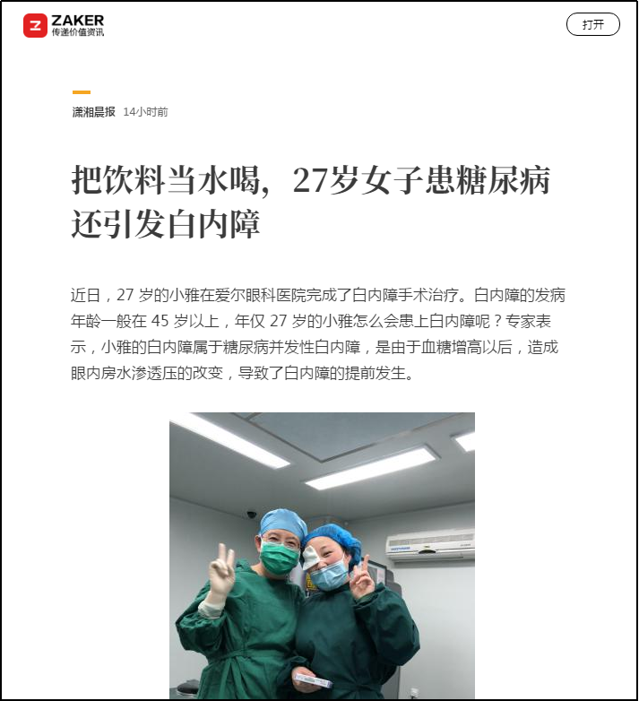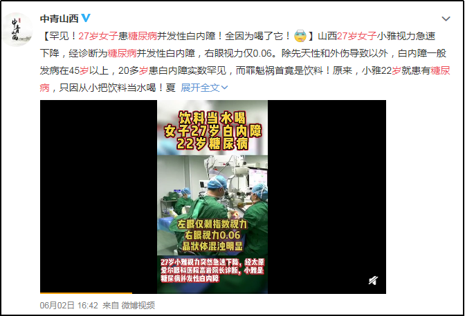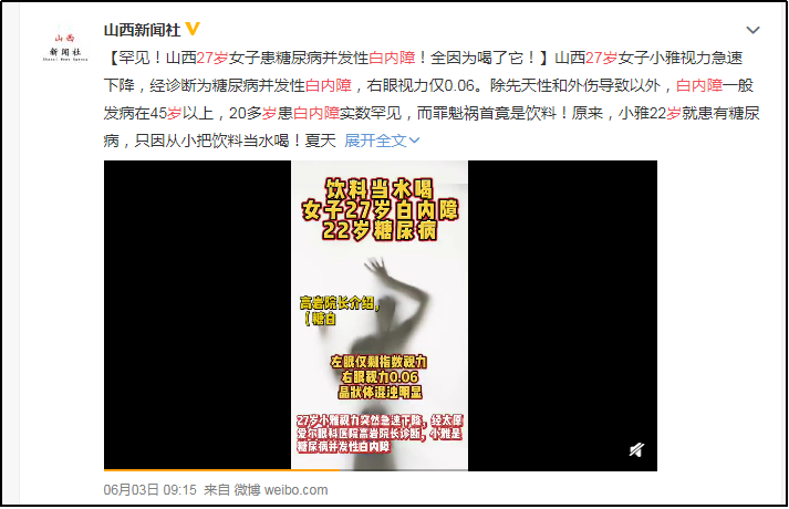 近日,一篇题为《饮料当水喝27岁女子患上糖尿病并发性白内障》的文章引起网友热议,相关文章、视频纷纷被人民日报客户端、羊城晚报、潇湘晨报、太原晚报、新浪新闻、凤凰新闻、ZAKER新闻、红网及新浪微博等各大平台转发。