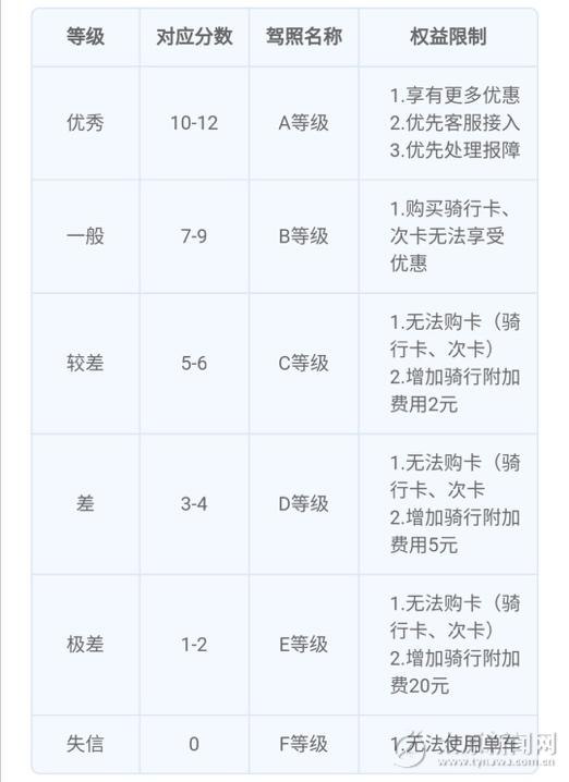 哈啰单车近期升级驾照分规则,新版的骑行驾照分满分12分,分为A到F共6个等级。