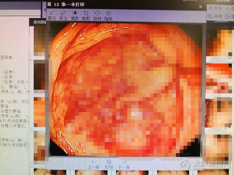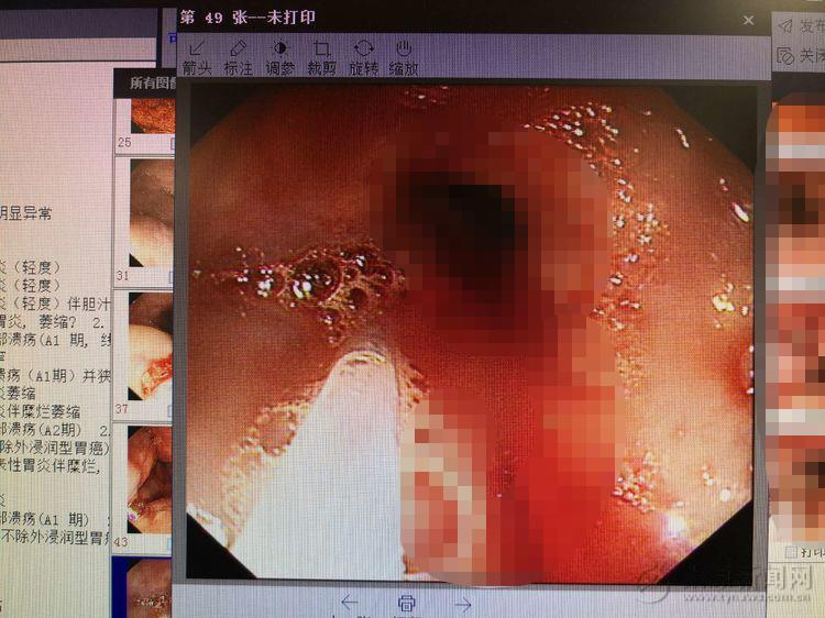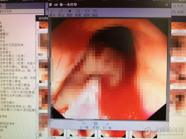 患者病情危急,身体虚弱,一刻也耽误不得。主治医生迅速将胃镜插入胃内仔细检查,发现十二指肠腔内不断有血流出,无法明确具体出血部位,反复冲洗后终于发现了罪魁祸首——覆着血凝块的溃疡。
