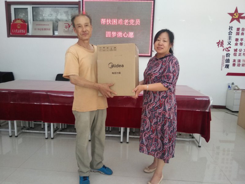 通过摸底,社区工作人员征集了他需要一个电压力锅的“微心愿”。经过迎泽群工发布后,区市场监督管理局机关第四党支部自愿认领了张师傅的“微心愿”。活动当天,区市场监督管理局党员代表们带上提前选购好的电压力锅来到老人家中,替他圆梦“微心愿”。党员代表与张师傅进行了亲切交流,详细询问他的家庭生活情况和实际困难,同时鼓励他继续用乐观的心态面对生活,在保护好身体的同时,力所能及发挥余热。