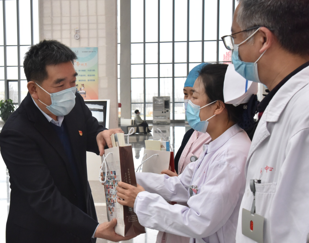 赵晋明向一线医护人员大爱无疆的奉献精神致敬,并向我院支援湖北医护人员赠送了专属礼遇文化包。王好君、侯丽、庞宇、张丽、郭惠艳作为代表接受了捐赠。
