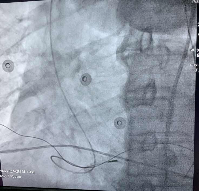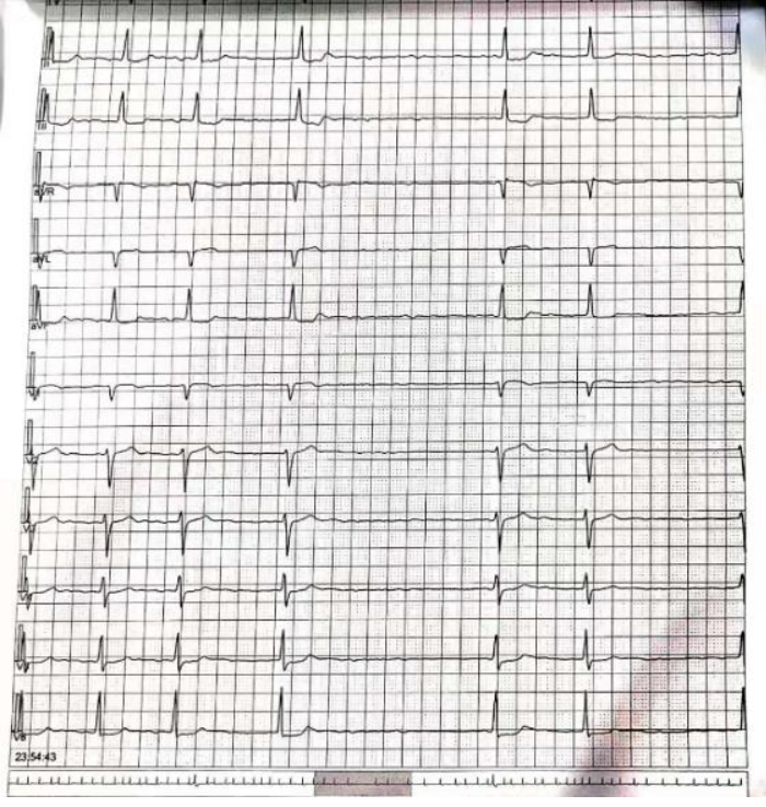 患者行心脏超声显示:EF34%,右房66*47mm,左房50mm,IVS 9mm,右室21mm,左室65mm,动态心电图提示频发室性早搏,短阵室速,经过规范的内科药物治疗,心力衰竭及肺部感染的症状及体征基本控制。