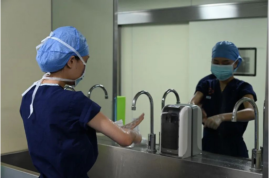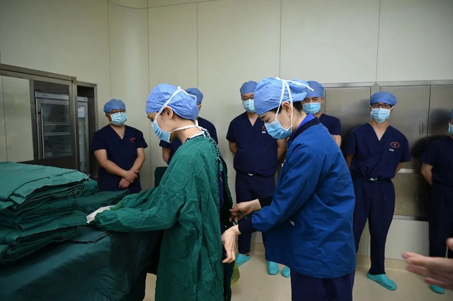 手术前医护人员洗手、穿无菌手术衣等规范操作。