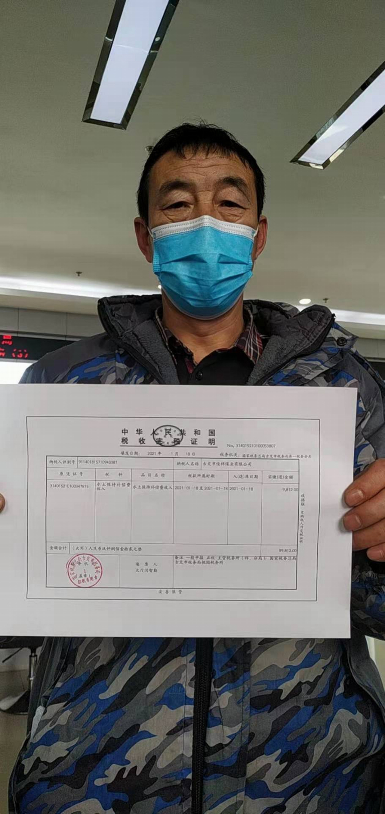 1月18,古交市税务局办税服务大厅开出古交市俊祥煤业有限公司缴纳的水土保持补偿费缴费凭证。