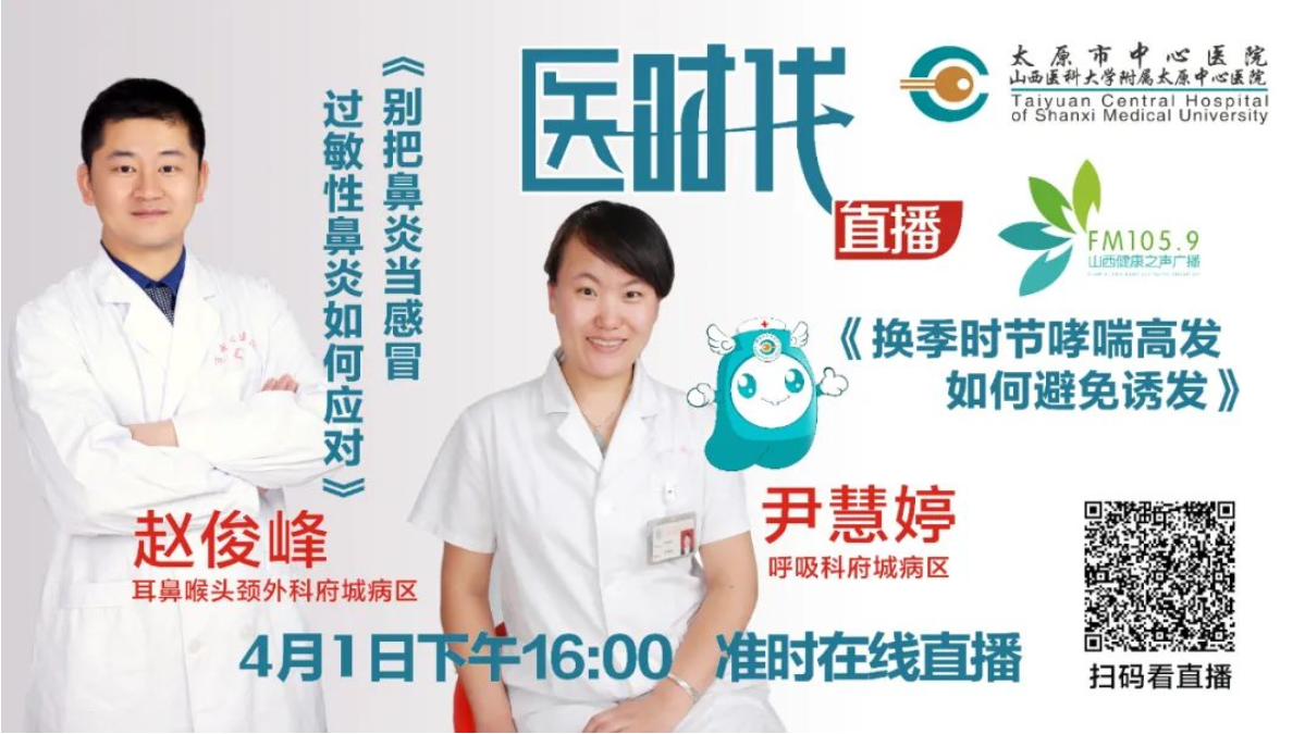 本期(4月1日)《医时代直播》邀请到太原市中心医院呼吸科府城病区主治医师尹慧婷、耳鼻喉头颈外科府城病区主治医师赵俊峰,分别带来主题为“换季时节哮喘高发,如何避免诱发”“别把鼻炎当感冒,过敏性鼻炎如何应对”直播讲解,让手机前的您享有多学科诊疗服务,对哮喘及过敏性鼻炎疾病更好地进行控制和管理,从而走出治疗误区,摆脱疾病烦恼!图片