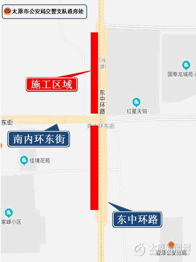 根据地铁1号线南内环东街站主体工程施工的需要,2021年4月6日0时至2022年12月30日24时将占用东中环路与南内环东街立交桥西侧(南、北)匝道进行封闭施工,封闭施工期间,该路段新建临时通行道路并设置交通信号灯,确保道路正常通行。