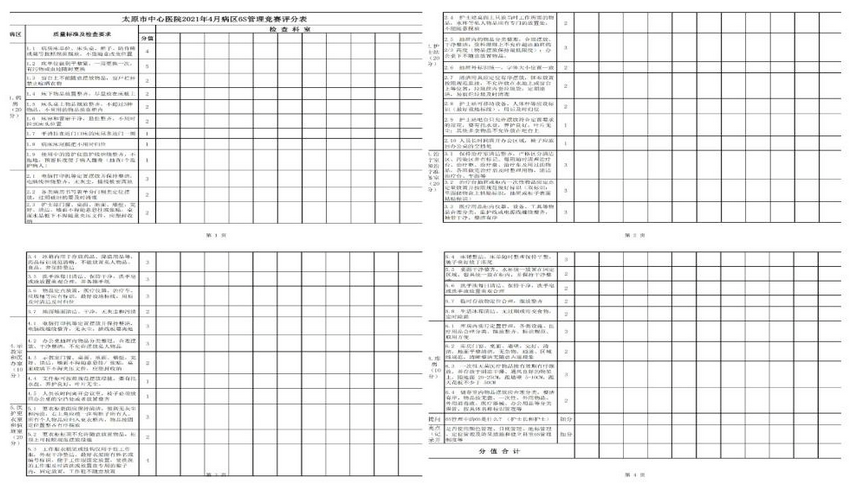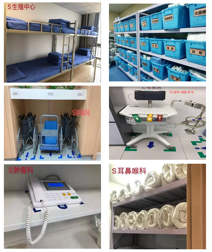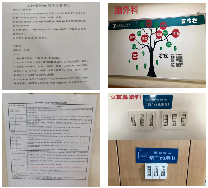 此次6S管理涉及府城院区27个、汾东院区33个临床科室以及两院区11个特殊部门。病区考核分为六部分内容(病房、护理站、治疗室、治疗准备室、示教室、医办室、医护更衣室、值班室和库房),并在科室颜色管理、目视管理、地标管理、定位管理、防呆措施及建立科室管理制度等创新项目设有加分项。