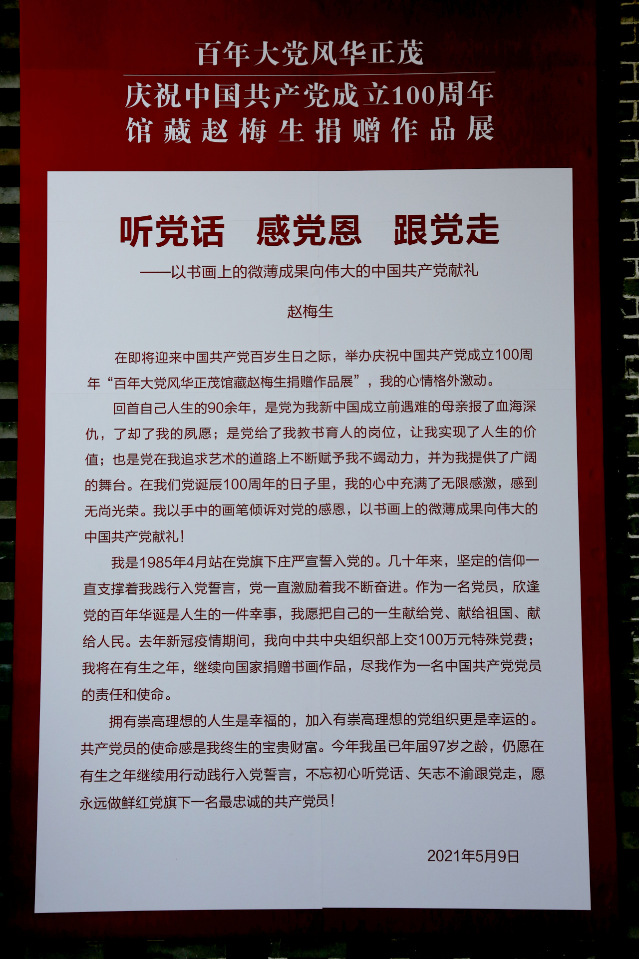 5月9日,“百年大党风华正茂——庆祝中国共产党成立100周年‘馆藏赵梅生捐赠作品展’”举行,表达了赵梅生先生“听党话、感党恩、跟党走”的红色情怀。这次展览展出了赵梅生美术馆部分馆藏赵梅生捐赠作品,共分11个主题172幅作品,是对党的生日的献礼和汇报。