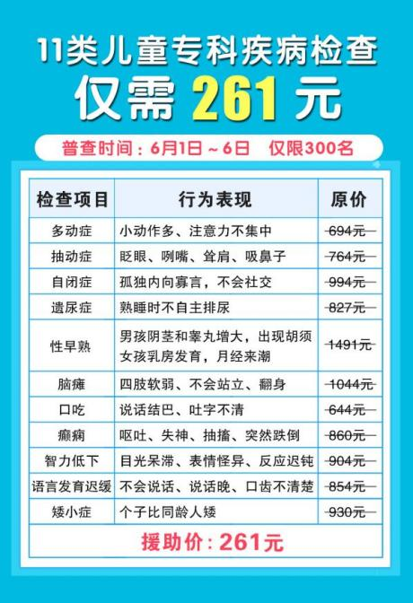 为了减轻家庭经济负担,太原天使天使儿童医院特推出多项检查费用优免活动,即十一类儿童疾病单项检查仅需261元,名额仅限前300名。