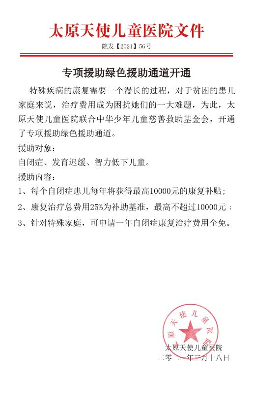 特殊疾病的康复需要一个漫长的过程,在治疗过程中,一笔笔昂贵的费用成为治疗路上的一大难题,为此,在六一会诊期间,太原天使儿童医院联合中华少年儿童慈善救助基金会,开通了专项援助绿色援助通道。