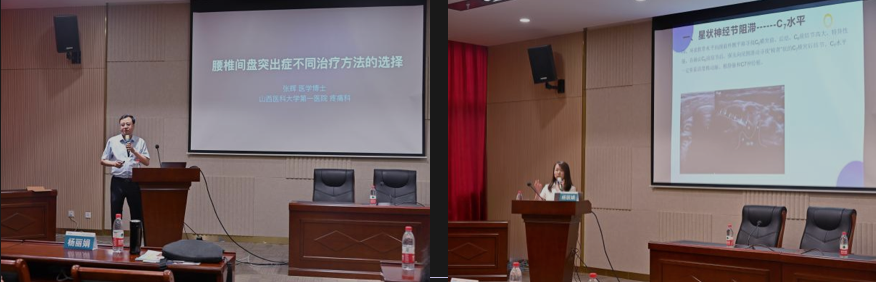 山西医科大学第一医院疼痛科副教授张辉、太原市中心医院汾东院区疼痛科主任李瑞婷分别讲授了《腰椎间盘突出症的疼痛科微创治疗方法》《超声引导技术在疼痛科中的应用》。