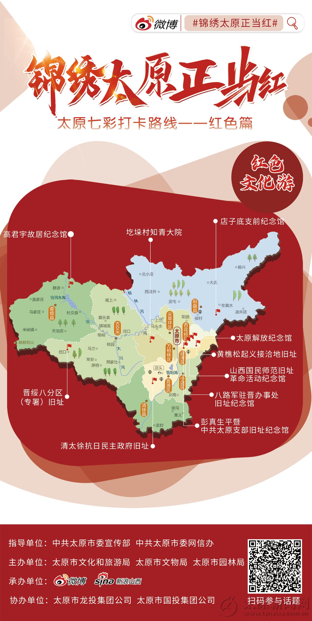 其中,“红色块——红色文化游”作为首条打卡路线,带您一览山西国民师范旧址革命活动纪念馆、彭真生平暨中共太原支部旧址纪念馆、八路军驻晋办事处旧址纪念馆、太原解放纪念馆等10处红色景点,彰显“锦绣太原正当红”宣传主题,庆祝中国共产党建党100周年。
