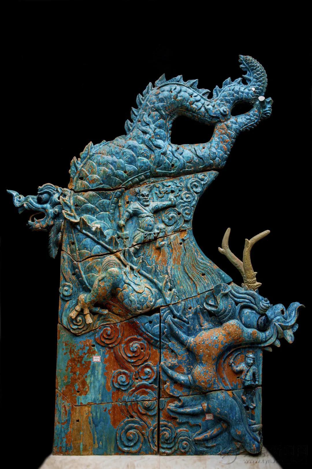 高达3米,原物位于三清殿屋顶正脊两端,为巨龙盘曲式,红泥作胎,孔雀蓝釉色。鸱吻张口吞脊,怒目圆睁炯炯有神,造型特殊,气势浩大。