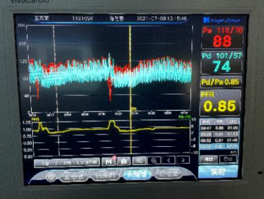 马登峰对王大爷狭窄的血管进行FFR检测,将一根压力微导管送入狭窄血管的远端,通过连接的仪器进行测试,右冠近端与前降支近端测试FFR值分别为0.91和0.85,均提示不需要植入支架治疗,只需要在右冠中段狭窄99%处植入一枚支架。