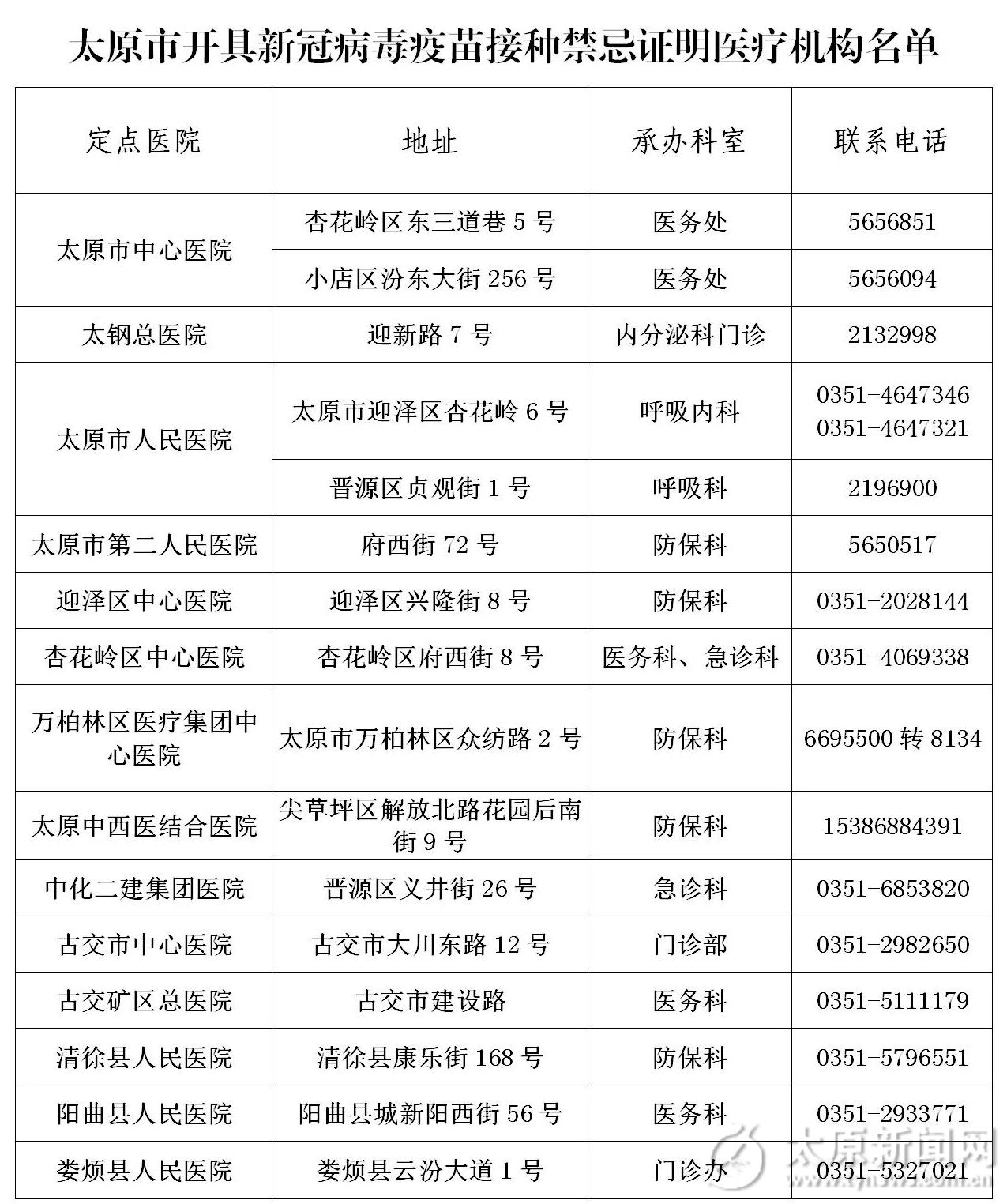 8月26日,太原市疫情防控办下发通知,为进一步推进新冠病毒疫苗接种工作,做到适龄人群且无接种禁忌新冠病毒疫苗“应接尽接”,做好接种禁忌证明开具工作,指定14所医疗机构为开具接种禁忌证明的定点医院,并明确了接种禁忌判定原则和开具流程。