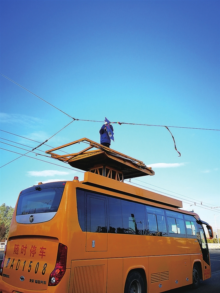 图为公交公司员工在清理断线风筝