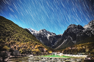 12月13日夜间在云南省丽江市玉龙雪山脚下拍摄的星轨(堆栈照片)。作为本年度最后一场大规模流星雨,北半球三大流星雨之一的双子座流星雨在12月14日迎来极大。新华社发