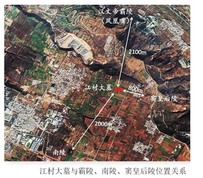 进入21世纪后,陕西省考古研究院和西安市文物保护考古研究院的考古工作者在西安市东郊的白鹿原西部地区展开了大范围的考古调查,并对世传的汉文帝陵所在的“凤凰嘴”,以及窦皇后陵、薄太后南陵等区域进行了大面积的考古勘探,基本确定了汉文帝霸陵陵区的大致范围、重要遗址的分布状况和形制布局,并新发现了一座“亞”字形大墓。这座新发现的大墓因位于西安市灞桥区江村而被称为江村大墓。