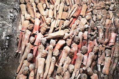 江村大墓外藏坑出土的着衣陶俑。新华社发