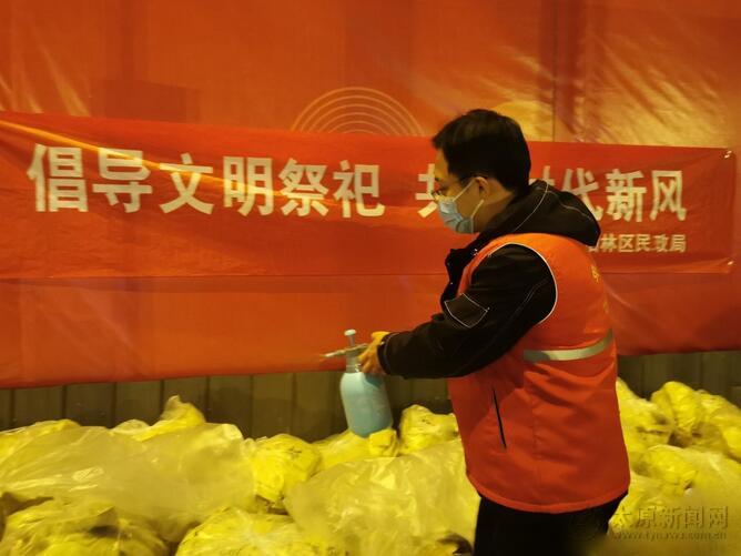 万柏林区民政局明确要求各点位严格落实疫情防控消杀要求,在前期已发放防疫手套、消杀喷雾器等防疫物质的基础上,区民政局紧急为全区37个环保焚烧袋安置箱投放点配发一批防疫面罩,全力做好清明祭扫高峰日一线人员防护。