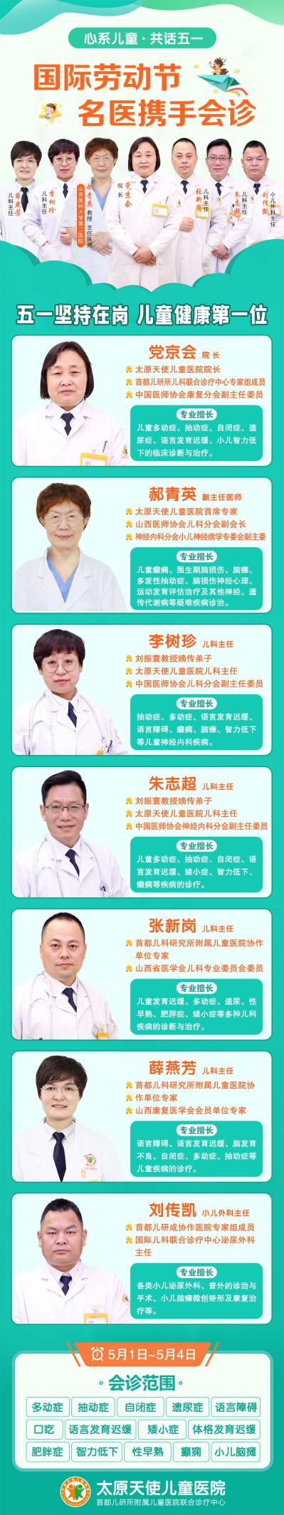 在五一劳动节期间,为了方便山西及周边患儿就诊,太原天使儿童医院院内专家正常上班。届时来院患儿就诊不仅免会诊费,同时可享受多学科联合专家面诊。太原天使专家团平均临床经验均在30年以上,为疾病的早期诊断和科学治疗提供专业权威的保障。