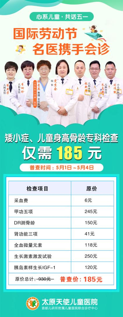 为解决广大家庭在五一小长假“挂号难”、“看病难”的问题,满足患儿利用假期“看病、看名医”的就诊需求,在“五一”期间,中华少年儿童慈善救助基金会联合太原天使儿童医院,特推出五一儿童成长发育专项健康体检,五一坚持在岗,共同守护儿童健康。