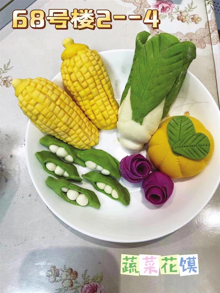 可爱的花馍“小动物”,造型逼真的花馍“蔬菜”……活动当天,居民通过小视频、图片等形式,将自己的作品一一摆上社区微信交流群的“餐桌”。在群里,居民们还互相讨论,分享烹饪技巧,拉近了彼此间的距离。本次活动共有65名居民参与,收到参赛作品70余个。