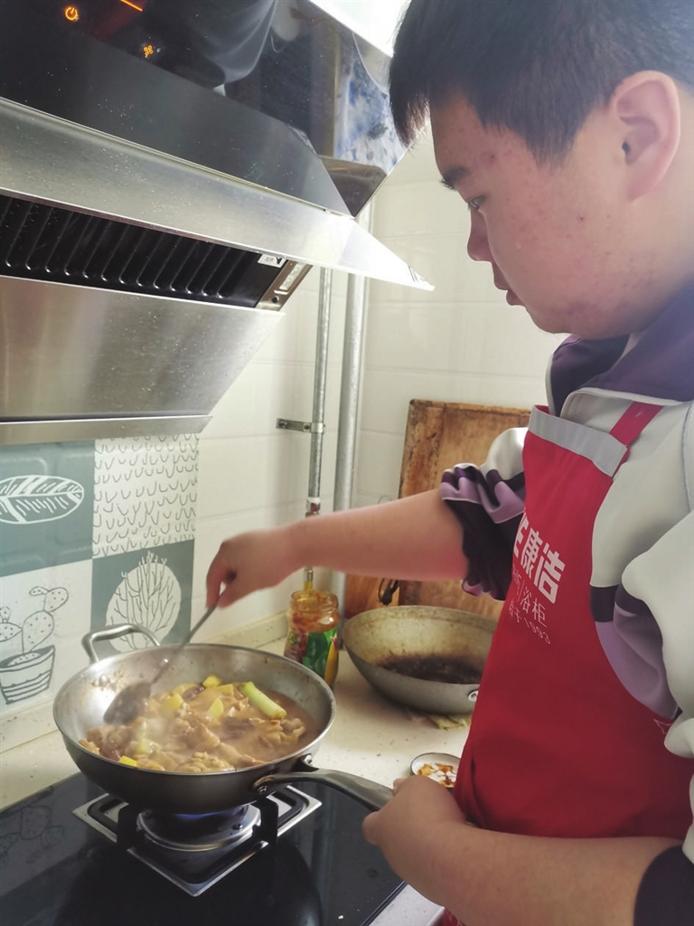 刘利阳在家炒菜做饭。