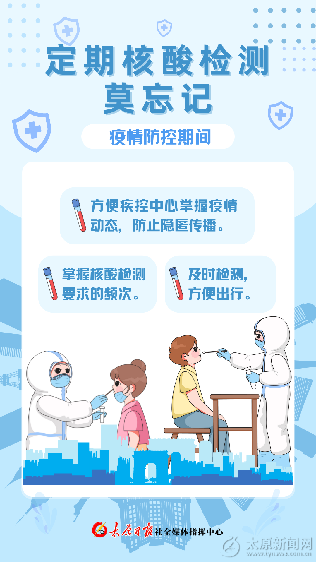 疫情防控莫松懈!定期核酸检测是做到早发现的重要手段。越早发现疫情就越容易将疫情对社会生产生活影响控制到最小。