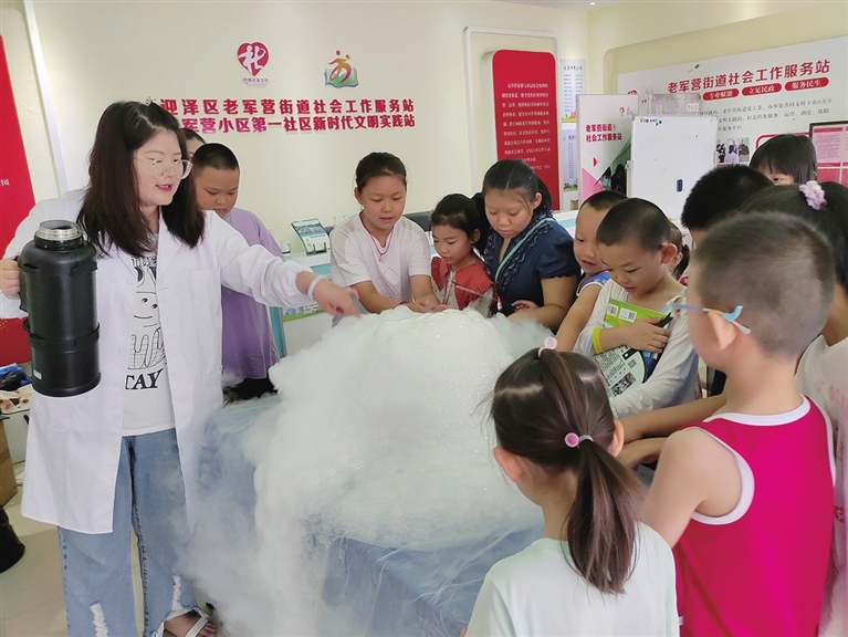 为弘扬科学精神、普及科学知识,8月15日上午,老军营小区第一社区联合社工站带领辖区青少年动手开展科学小实验,近距离感受科学魅力。大家先后动手做了“火焰掌”“大象牙膏”“人间仙境““空气炮”“火山喷发”等实验。孩子们在实验中探索科技魅力,主动思考游戏中蕴含的科学知识。