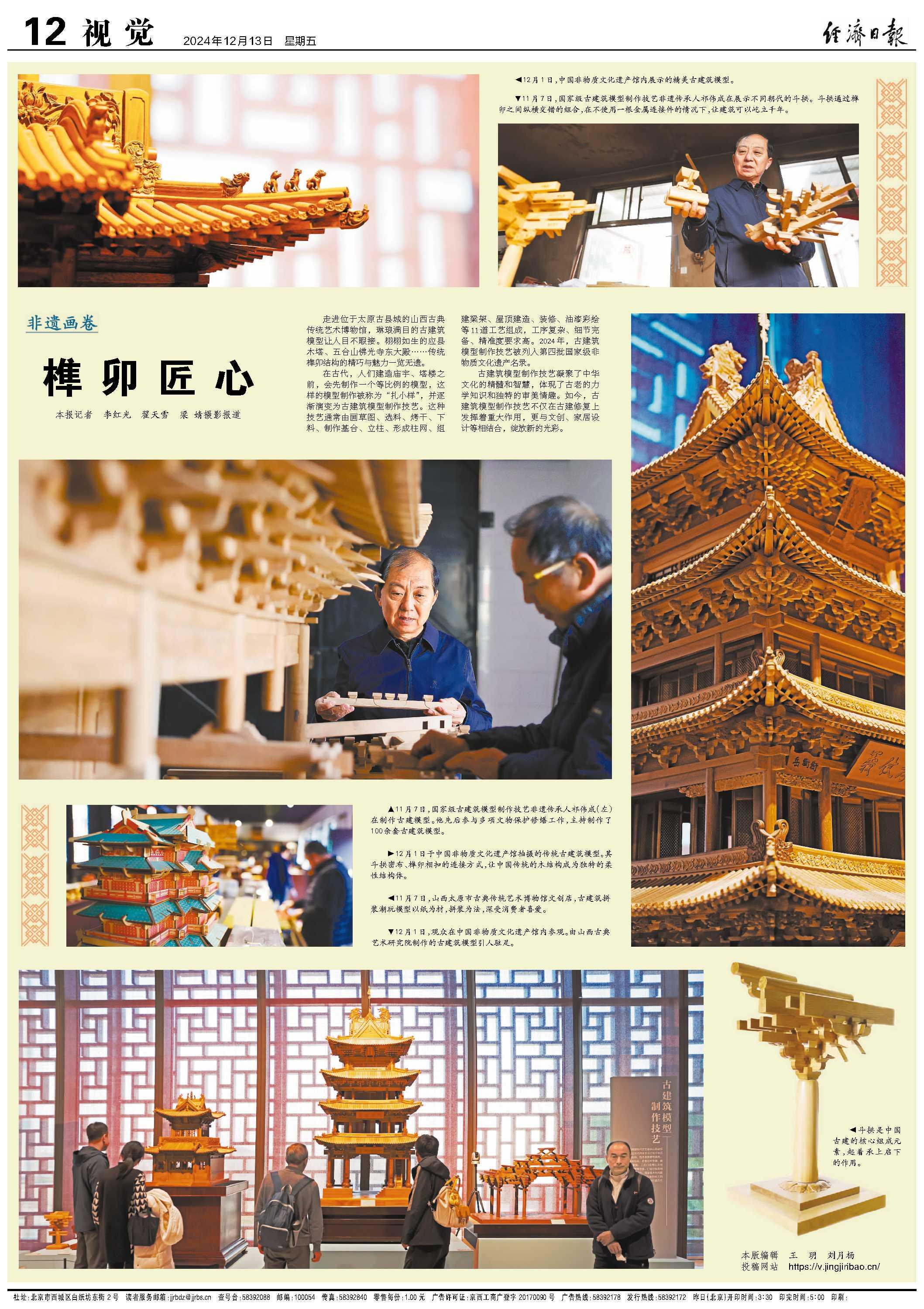 在古代,人们建造庙宇、塔楼之前,会先制作一个等比例的模型,这样的模型制作被称为“扎小样”,并逐渐演变为古建筑模型制作技艺。这种技艺通常由画草图、选料、烤干、下料、制作基台、立柱、形成柱网、组建梁架、屋顶建造、装修、油漆彩绘等11道工艺组成,工序复杂、细节完备、精准度要求高。2024年,古建筑模型制作技艺被列入第四批国家级非物质文化遗产名录。