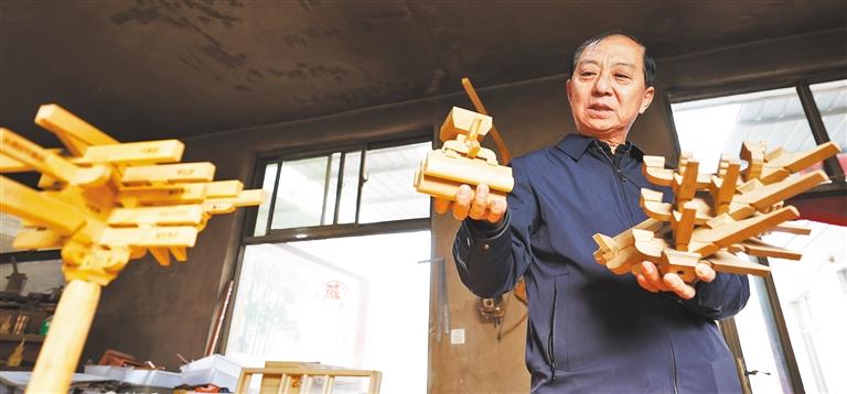 11月7日,国家级古建筑模型制作技艺非遗传承人祁伟成在展示不同朝代的斗拱。斗拱通过榫卯之间纵横交错的组合,在不使用一根金属连接件的情况下,让建筑可以屹立千年。