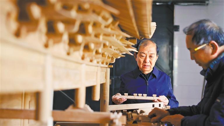 11月7日,国家级古建筑模型制作技艺非遗传承人祁伟成(左)在制作古建模型。他先后参与多项文物保护修缮工作,主持制作了100余套古建筑模型。