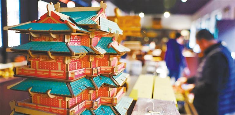 11月7日,山西太原市古典传统艺术博物馆文创店,古建筑拼装潮玩模型以纸为材,拼装为法,深受消费者喜爱。