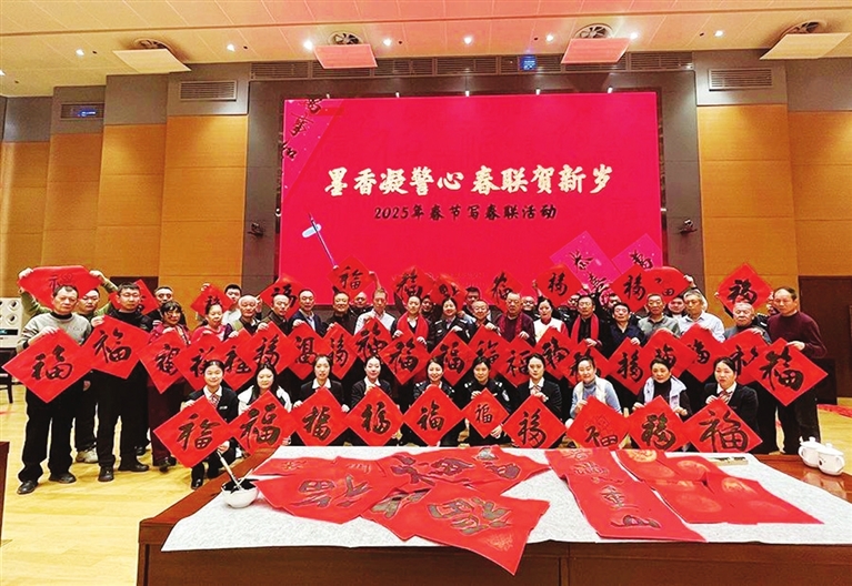 1月21日,市公安局邀请多位省市书法名家和警营书法爱好者,组织开展“墨香凝警心 春联贺新岁”2025年春节写春联活动,进一步弘扬中华优秀传统文化,营造浓厚节日氛围。受邀书法家挥毫泼墨、妙句成双,笔锋游走间,一张张红红火火的“福”字、一副副吉祥喜庆的春联,传递着对公安民警的真挚祝福和美好祝愿。杨沫 霜红 摄影报道