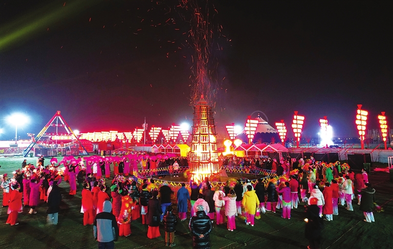 1月29日,小店区刘家堡第四届“堡里有年味 回村过大年”花灯节现场,游客围绕旺火共同庆祝新春佳节的到来。