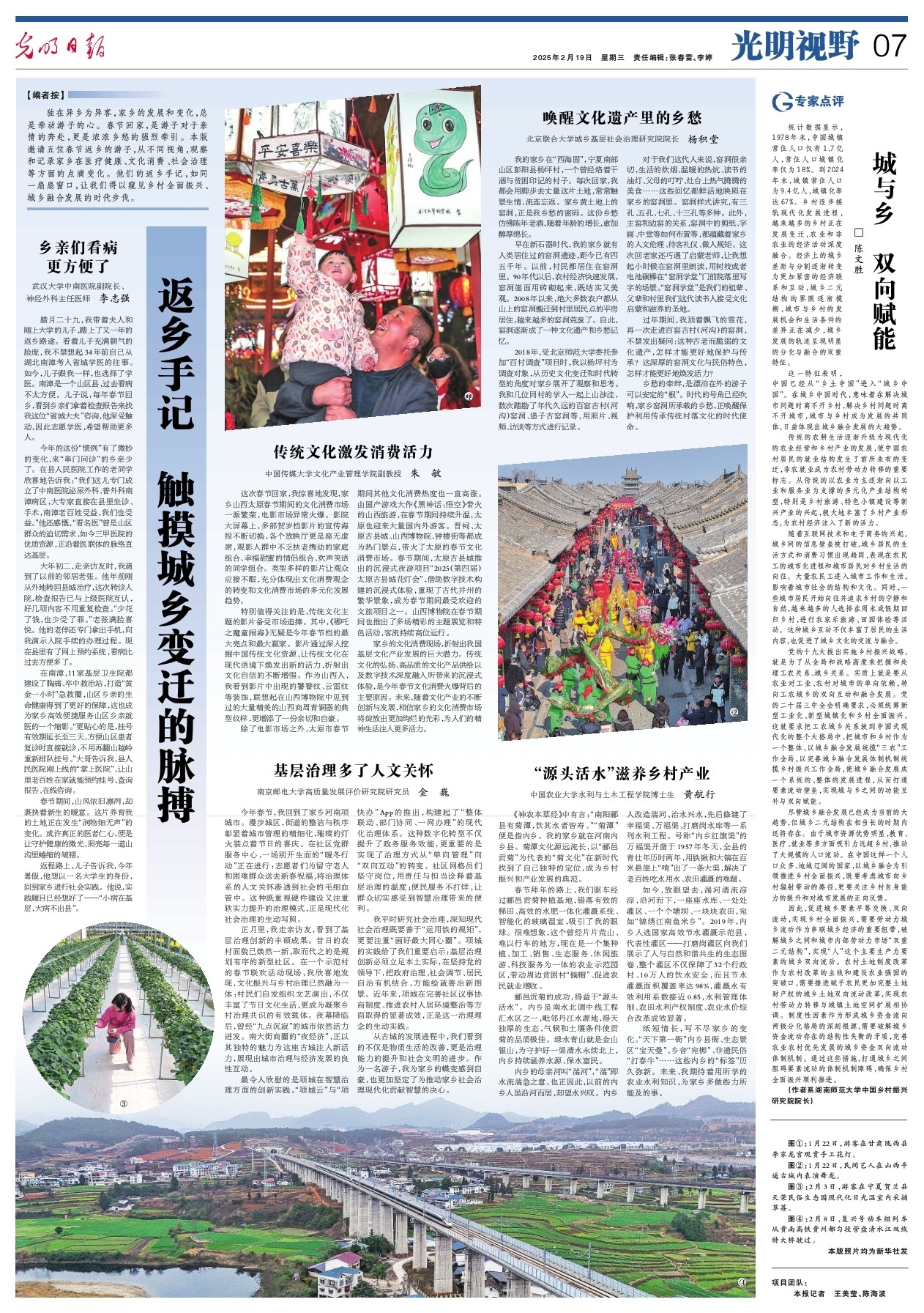 独在异乡为异客,家乡的发展和变化,总是牵动游子的心。春节回家,是游子对于亲情的奔赴,更是浓浓乡愁的强烈牵引。本版邀请五位春节返乡的游子,从不同视角,观察和记录家乡在医疗健康、文化消费、社会治理等方面的点滴变化。他们的返乡手记,如同一扇扇窗口,让我们得以窥见乡村全面振兴、城乡融合发展的时代步伐。