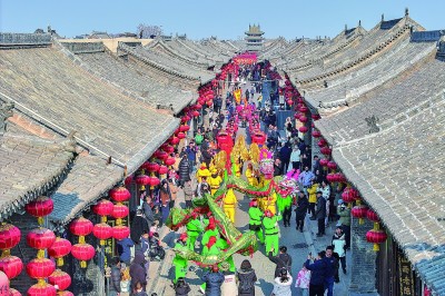1月22日,民间艺人在山西平遥古城内表演舞龙。