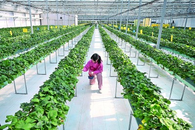 2月3日,游客在宁夏贺兰县天荣民俗生态园现代化日光温室内采摘草莓。