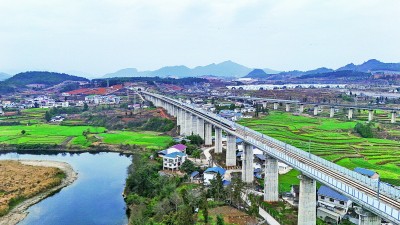 2月8日,复兴号动车组列车从贵南高铁贵州都匀段营盘清水江双线特大桥驶过。