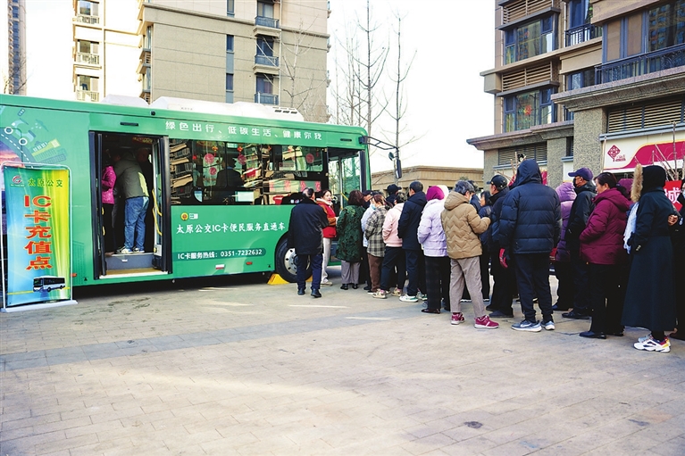 2月25日,一辆绿色印有“太原公交IC卡便民服务直通车”字样的公交车缓缓驶入恒大山水城社区广场,我市首辆公交IC卡便民服务直通车正式投入运营,为大型小区居民带来“家门口”的智慧出行服务。
