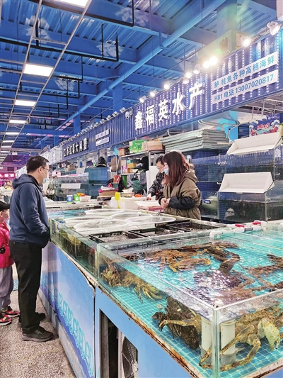与蔬菜、水果等生活必需品相似,在五龙口海鲜批发市场等大型批发冷冻食品的市场,前来批发采购畜产品、水产品的人同样熙来攘往。商贩们忙着吆喝,顾客们忙着挑选,袅袅升腾的“烟火气”扑面而来。