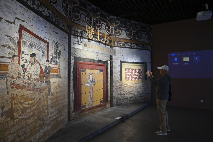 在山西博物院,游客在“壁上万千——山西宋金壁画中的众生气象”展览上拍照(2024年5月16日摄)。