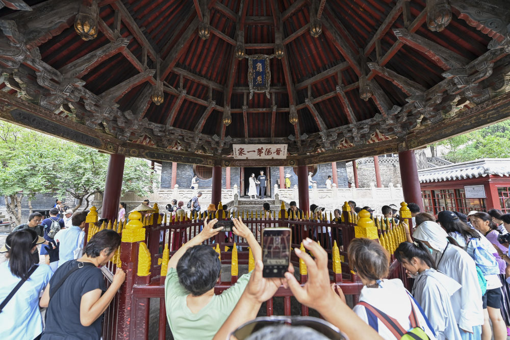 游客在晋祠博物馆的难老泉参观拍照(2024年7月25日摄)。新华社记者 杨晨光 摄