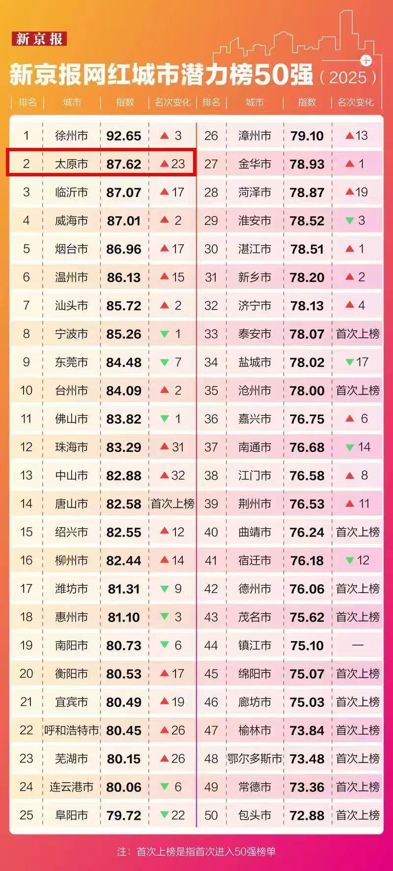 4月22日,在新京报主办的“直面关税战,锻造经济韧性——2025新京智库春季论坛”上,新京智库发布了《新京报网红城市潜力报告(2025)》,并发布了《新京报网红城市榜潜力50强(2025)》榜单。太原以“黑马之姿”从2024年的中游跃升至全国第二,狂升23位,成为华北地区最耀眼的“网红新星”。