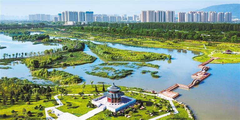 俯瞰太原市汾河湿地公园。近年来,汾河太原城区段生态环境和水质持续改善。(太原市汾河管委会供图)