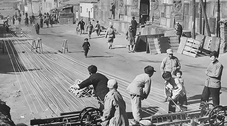 1948年,工人在街边制作铁丝网。(资料照片)